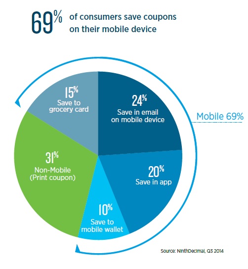 Overall, 69% of grocery shoppers prefer to find/save coupons on their mobile device versus printing them out to bring to the store. That is a 25% increase from 2013.