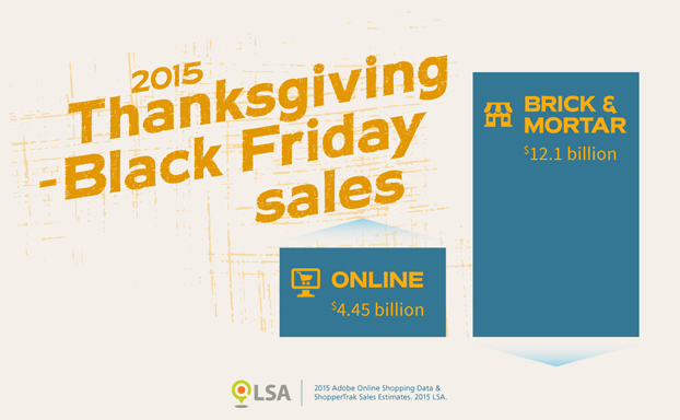The data comes from ShopperTrak sales estimates, 2015 Adobe online shopping data and ChannelAdvisor “Same Store Sales” data. To access and share the graphic above, click here.