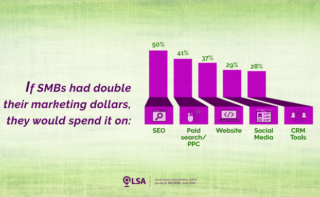 According to a new LSA survey, 50% of SMBs would invest in SEO if they had double their current marketing budget and 41% would invest in paid search/PPC. Websites (37%), social media (29%) and CRM Tools (28%) made up the rest of the top five channels.
