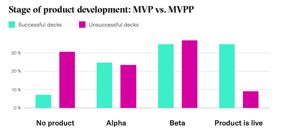 Beyond the tactics of what should go in the deck itself, there are broader measures of successful decks that trace back to the startup in question. For example, when looking at startup lifecycle, the biggest factor that correlates to successfully securing seed funding is whether or not its product is live.