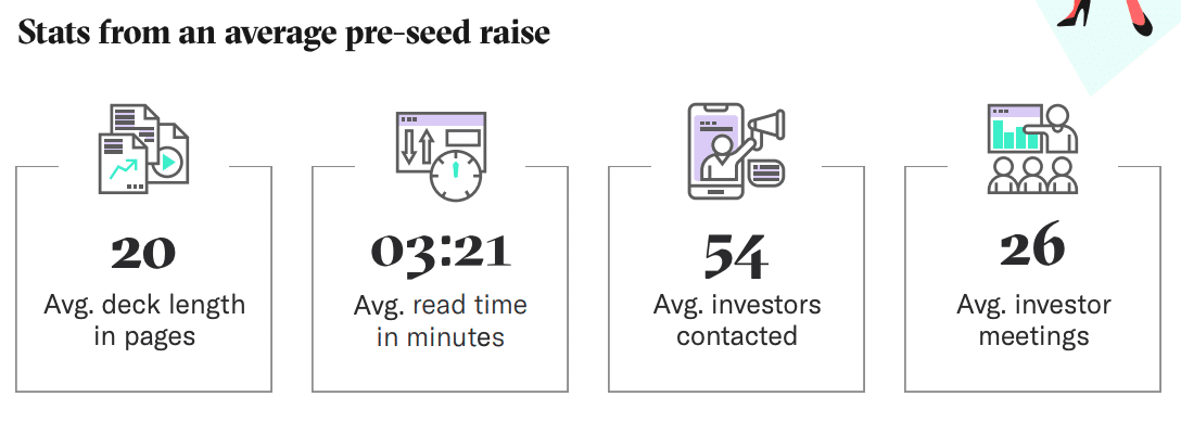 The average time spent with pre-seed pitch decks was 3:21. This can be a discouraging figure, giving all of the hours put into a given pitch’s production. The lesson is that you don’t have a lot of time to capture an investor’s interest so choose wisely what to include and to front-load captivating material.
