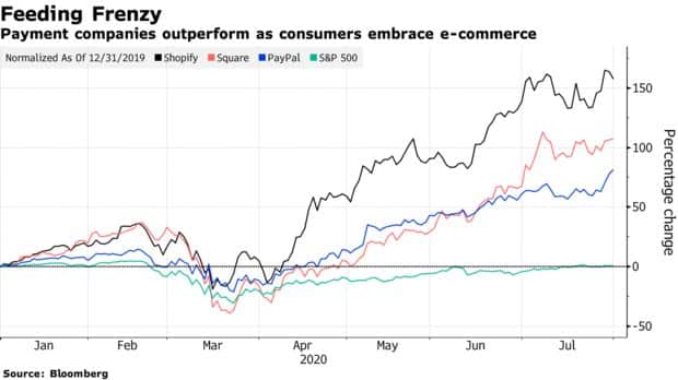 Validating online payment growth, PayPal reports a 30 percent jump in newly active customers who use the service at least four times in ten days. As a result, PayPal’s stock price has grown 80 percent year-to-date. While we’re at it, Shopify shares have grown 170 percent and Square has grown 113 percent.