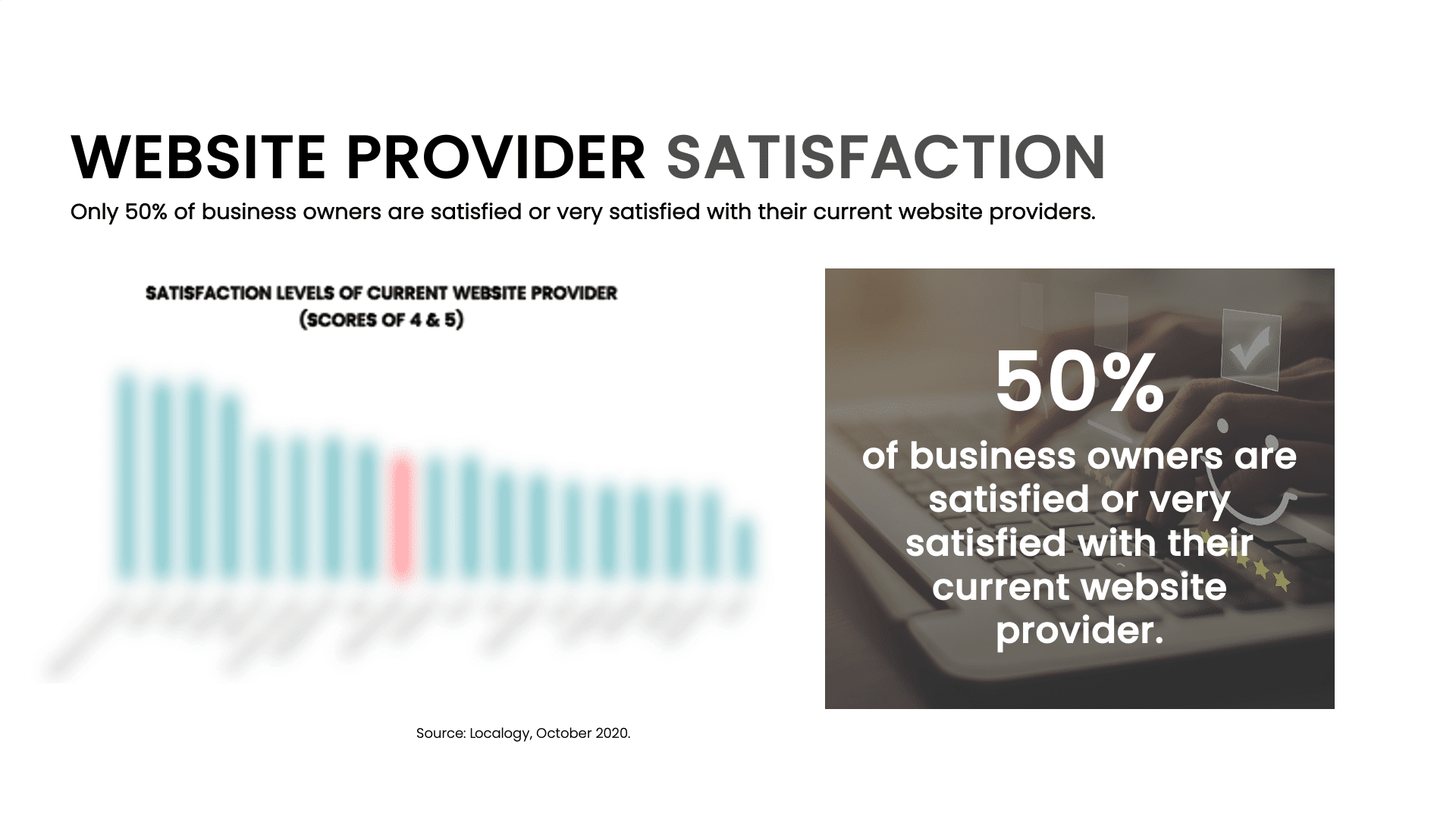 Now, onto their satisfaction ratings. At a high level, 50 percent of SMBs are satisfied with their website provider. Drilling down into individual providers, top marks went to Network Solutions (83 percent), Site 123 (80 percent), Shopify (80 percent), Strikingly (75 percent) and Web.com (59 percent).