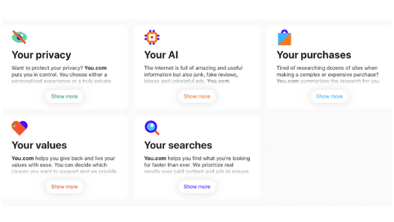“You.com helps you find what you’re looking for faster than ever. We prioritize real results over paid content and ads to ensure that you can trust the integrity of our results. A whole new interface will allow you to get to the content you seek faster and build your own curated knowledge base.”