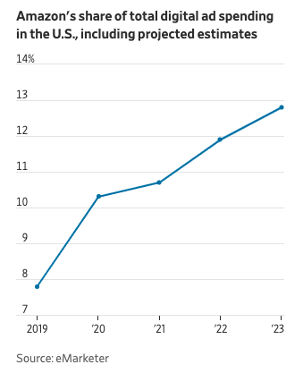 The latest evidence comes in today’s WSJ article (subscription req’d) that cites eMarketer estimates that Amazon has broken the 10 percent barrier. It’s estimated to have brought in $15.73 billion in ad revenue for full-year 2020, which is up 52 percent year-over-year. This inches Amazon past the 10 percent mark.