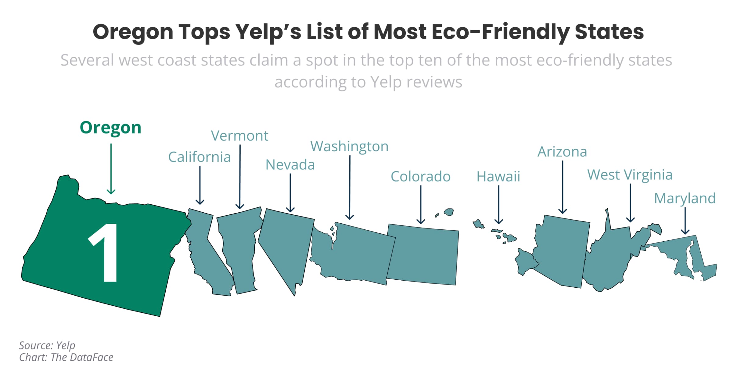 Thirdly, Yelp is amplifying the awareness of all of the above with a good-old listicle. It has ranked the most eco-friendly states based on aggregated Yelp data. Oregon, California, Vermont, Nevada, and Washington topped the list, which you can see in the below graphic and in full here.
