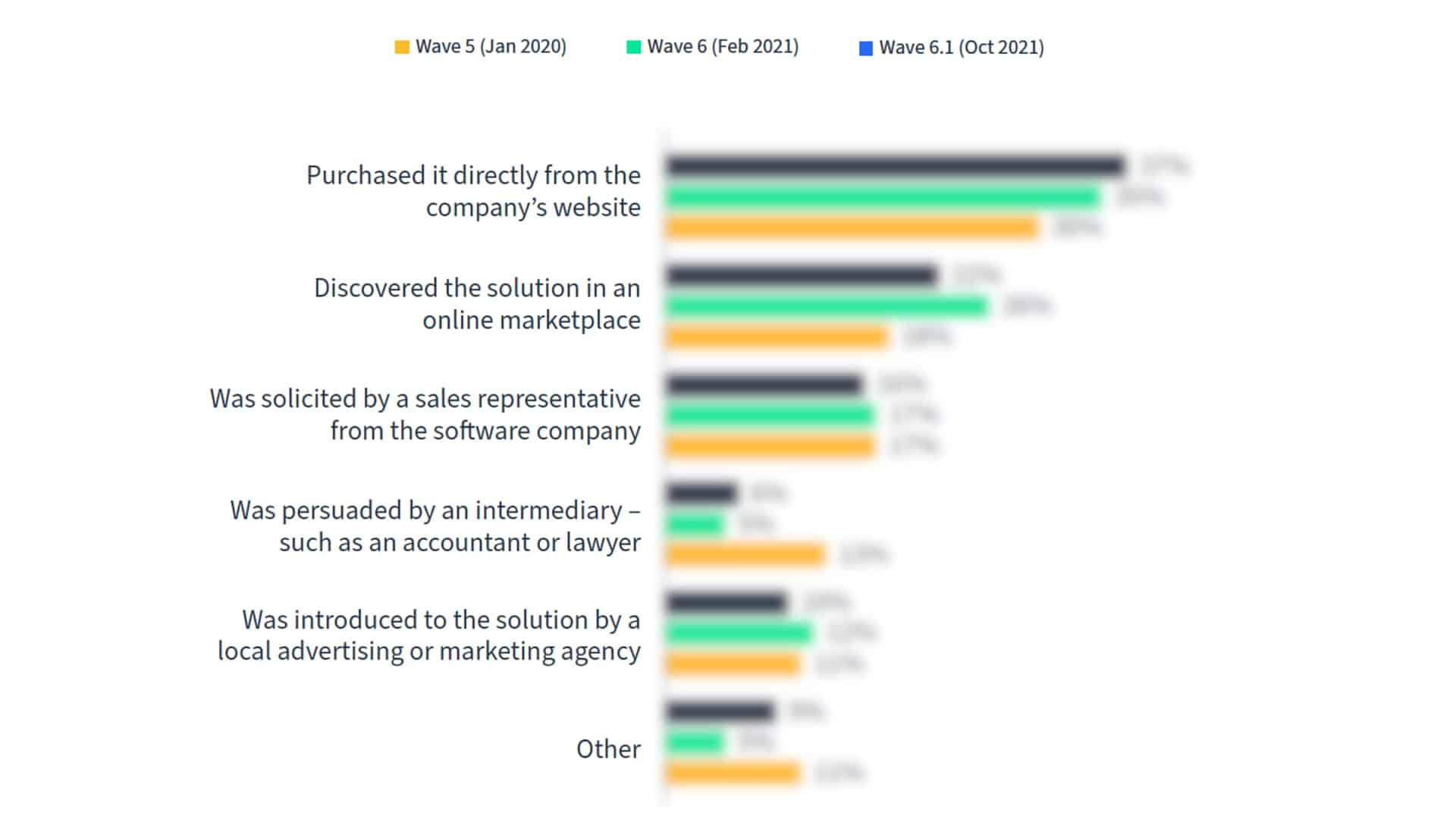 Specifically, the most popular channel to purchase software is directly on a provider’s website (37 percent). That’s followed by online marketplaces (22 percent), sales rep solicitation (16 percent), local marketing agencies (10 percent), and intermediaries like a lawyer or accountant (6 percent).