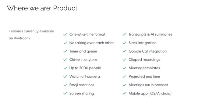 Waitroom seeks to improve online meetings with the addition of new features designed to cut out the things that make meetings awful (e.g. cross-talk). And use AI tools (hence the comparison to Shim’s Read AI) to optimize the valuable things that meetings produce. Waitroom will do this by producing AI transcripts that can be mined for accountability, follow-ups, action items, etc.
