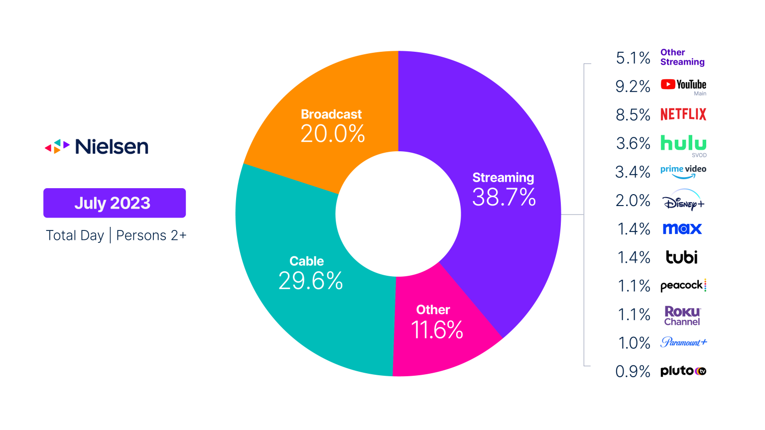 Going deeper into the numbers, Nielsen’s July 2023 Report (scintillating title) quantifies cable’s market share at 29.6 percent, down 12.5 percent year-over-year. Broadcast TV meanwhile stands at 20 percent market share, down 5.4 percent year-over-year. That puts their collective share just shy of 50 percent.