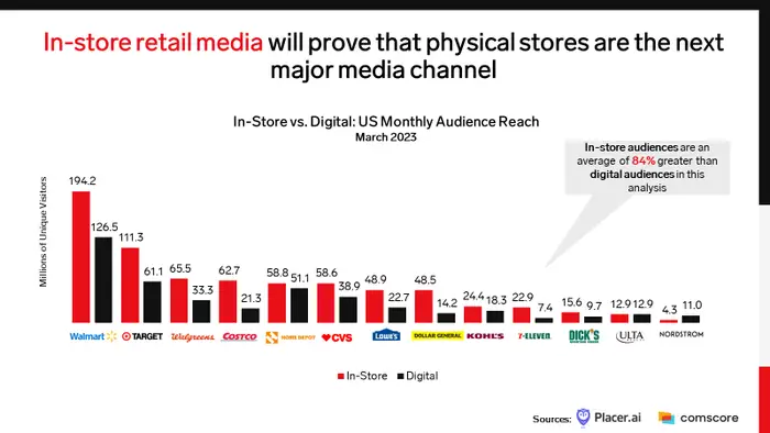 In fact, according to Insider Intelligence, retailers’ in-store audiences are 84 percent larger than their digital audiences. And that’s amplified for Walmart, given 200 million monthly shoppers. This scale means that it won’t just benefit from retail media, but could buoy the $40 billion category altogether.