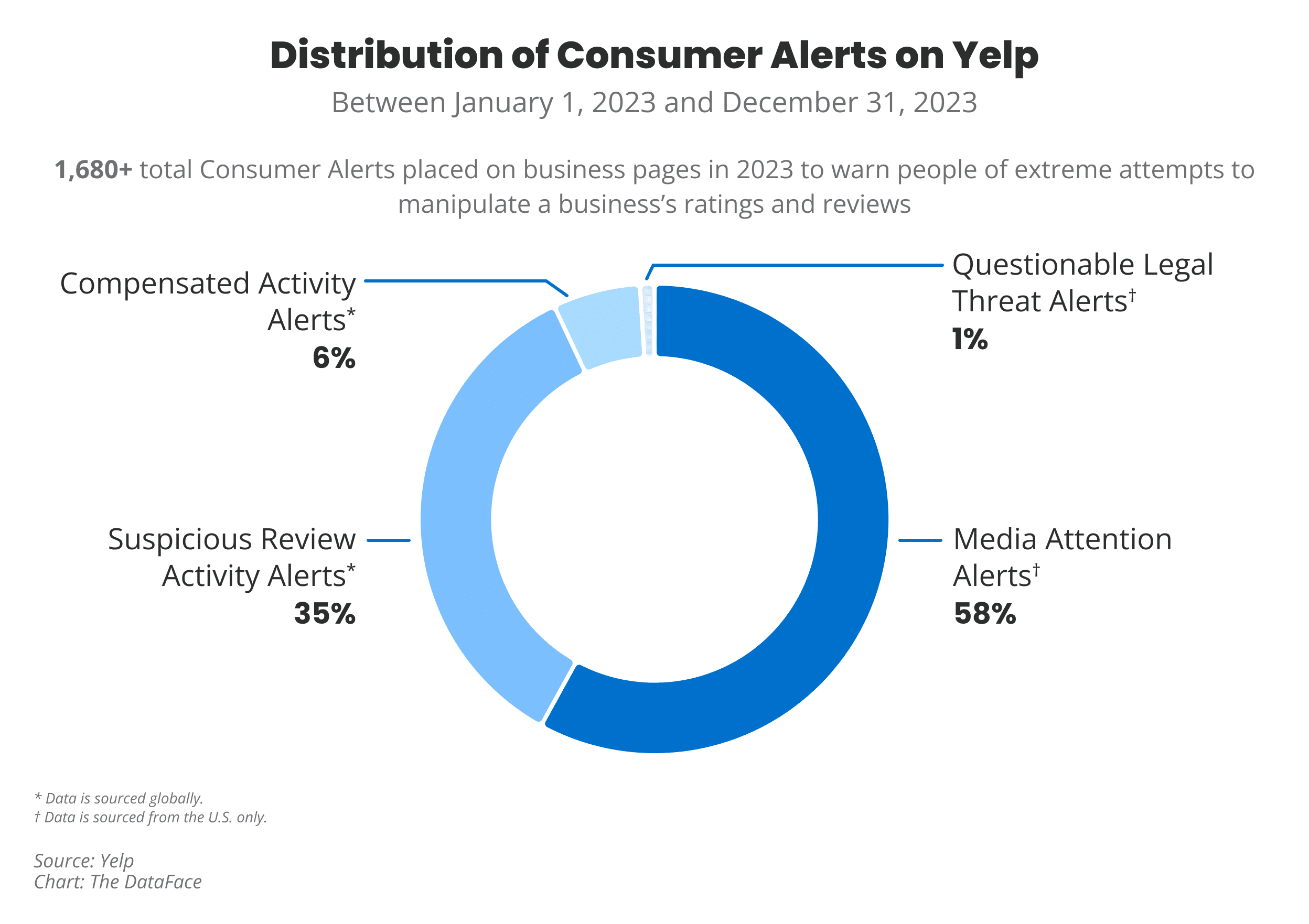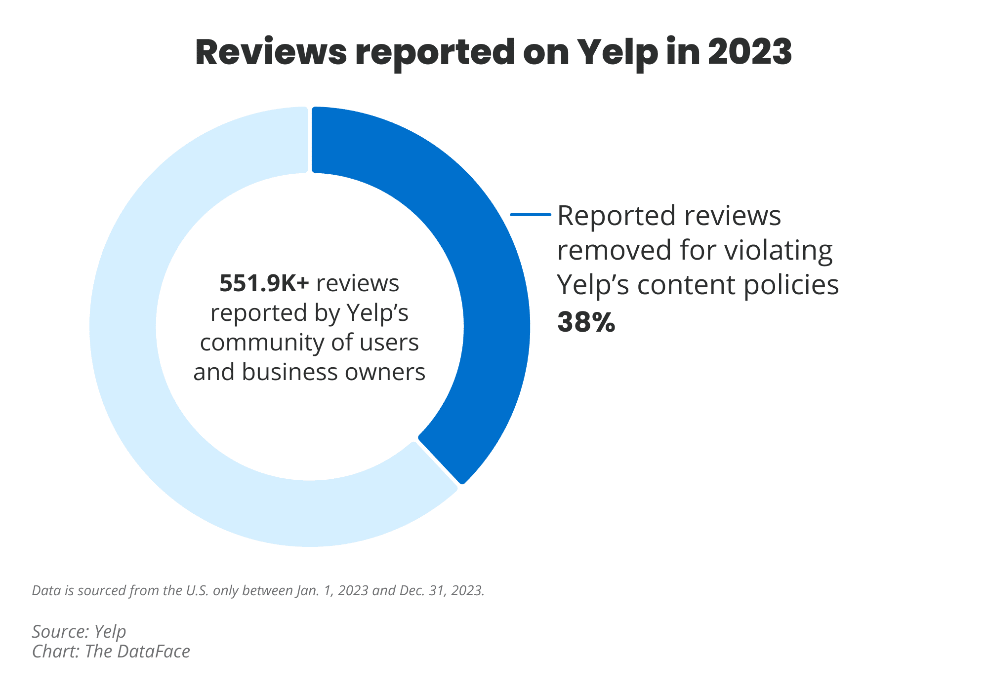 - 53,000+ reported reviews were removed by Yelp’s moderators in 2023 for not reflecting firsthand customer experiences.